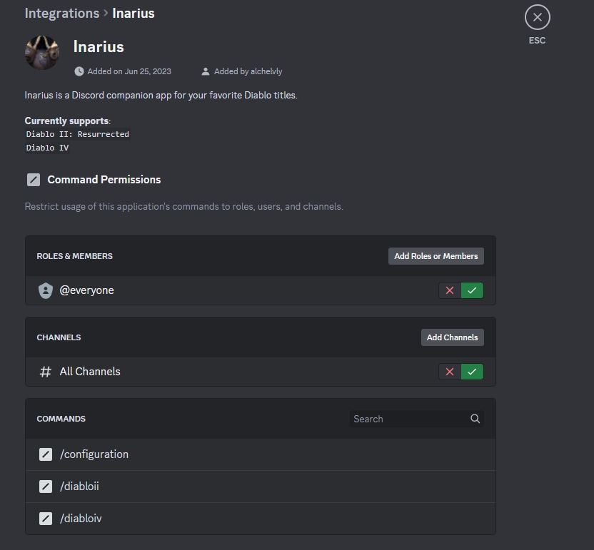 You can achieve this by going into Server Settings -> Integrations -> Inarius(Manage)